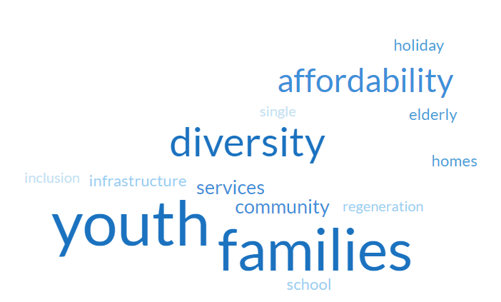 We got some great responses to this question with common themes including diversity of the community and the importance of young people and families being able to live here and support local services and businesses. There was a really strong sentiment in support of the vibrancy of the community and keeping the village alive.