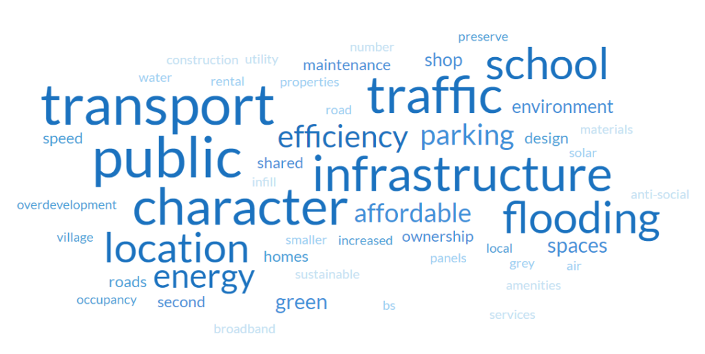 Answers to this question has given us some real insights into the potential issues that new housing would bring to the community – and it’s really helped focus us on areas to investigate – so thank you! Some of the main concerns were around infrastructure, whether that be roads, sewerage, traffic volume, the lack of public transport or increased flooding potential. The environment and preserving the character of the village also came across strongly, as well as a desire for the homes to be affordable to run, in terms of being energy efficient, as well as affordable to buy or rent.